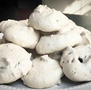 4). Add the chocolate and small licorice pieces in the egg white mixture. Remember to turn the chocolate pieces in the egg mixture, since stirring the chocolate in, can damage the final layout.