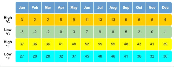 Here is a picture of average temperatures in Iceland for the whole year, both in Celcius and Farenheit, low and high averages.